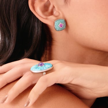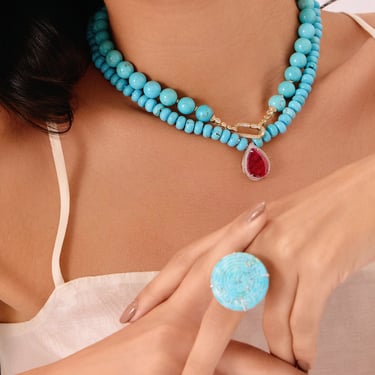 Na joalheria, a turquesa cria contraste sofisticado quando combinada à prata, resultando em peças de forte identidade visual.
