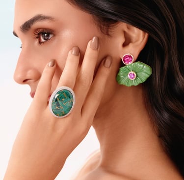 Mais do que uma escolha estética, a cor passa a ser linguagem. Cada tonalidade carrega sensações, significados e estados de espírito que refletem o comportamento contemporâneo do consumidor, cada vez mais interessado em peças que representem sua identidade e seus valores. As pedras naturais, com suas variações únicas e imperfeições orgânicas, tornam-se o meio ideal para expressar essa nova visão de luxo.