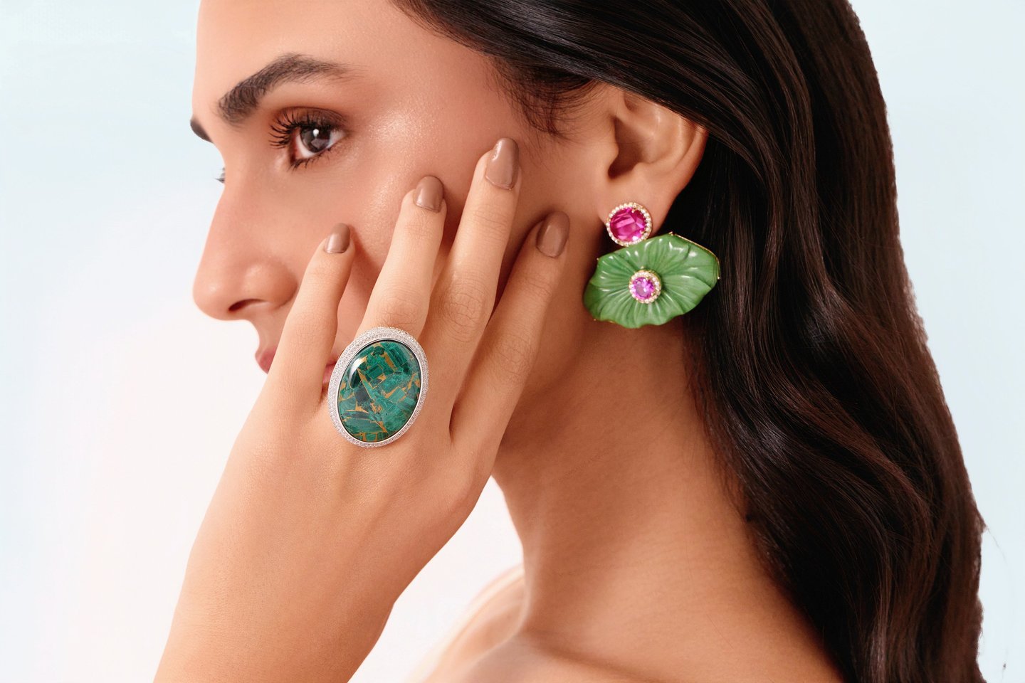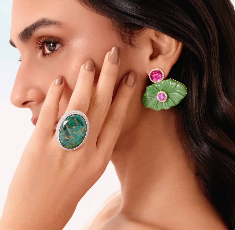 Mais do que destacar pedras isoladas, a joalheria de 2026 trabalha a cor de forma estratégica, criando paletas coerentes e narrativas visuais bem definidas. Combinações inspiradas na natureza, como azuis e verdes aquáticos, aparecem com frequência, assim como misturas delicadas de rosa, lavanda e tons neutros.