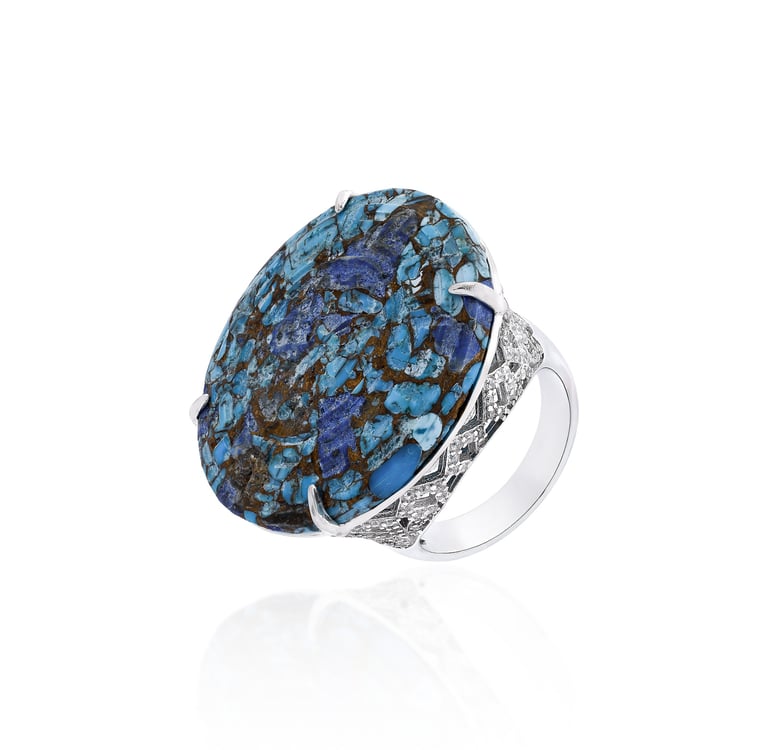 A turquesa natural, por sua vez, retorna com força total, mas sob uma nova leitura. Em vez do visual excessivamente boho, ela surge em designs contemporâneos, combinada a metais polidos ou texturizados e a linhas mais arquitetônicas. Seus tons azul-esverdeados, muitas vezes marcados por veios naturais, reforçam o apreço pelo aspecto orgânico e artesanal.