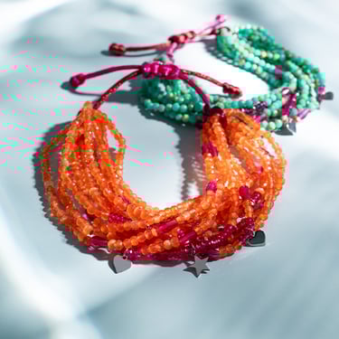 A matéria-prima escolhida para a coleção reforça esse conceito de autenticidade. Desenvolvida a partir de pedras naturais, Tidal valoriza aquilo que não se repete. Veios, nuances de cor, transparências e desenhos orgânicos fazem parte da identidade de cada joia, revelando a beleza do que é genuíno. As cores vibrantes surgem de maneira orgânica, sem excessos, criando composições que remetem às profundezas do mar, às formações rochosas moldadas pelas marés e à interação constante entre água e luz.